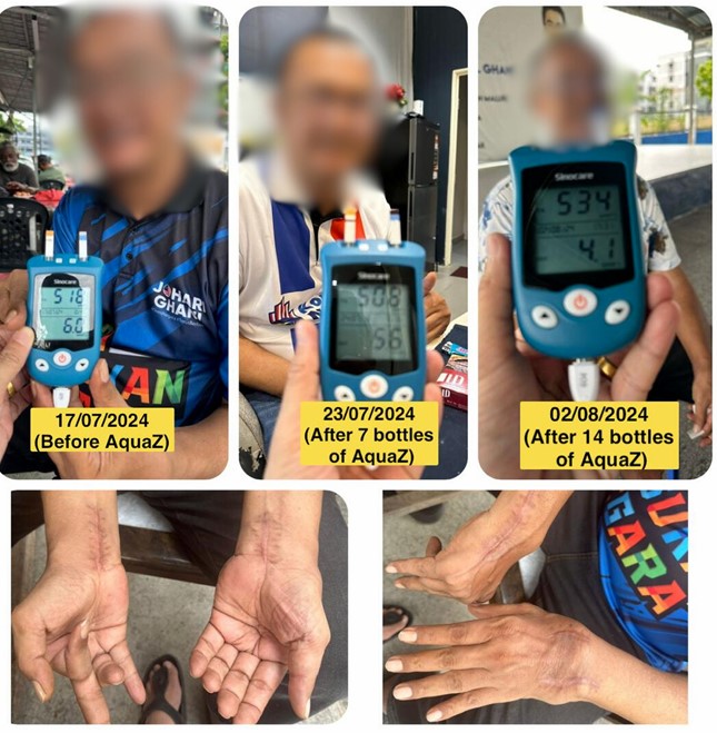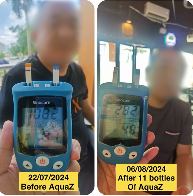 After 7 bottles of Aquaz in 7 days, she was very surprised that uric acid and glucose level dropped significantly and no more blurry vision.